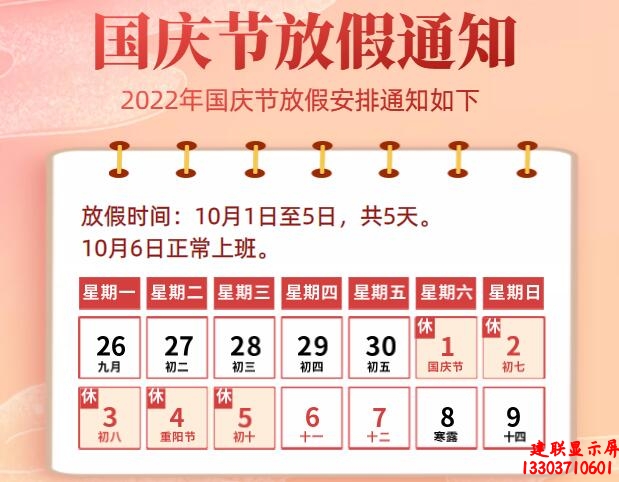 尊敬的各位客戶:國慶節(jié)將至,鄭州LED顯示屏廠家河南建聯(lián)電子科技有限公司祝大家國慶節(jié)快樂!